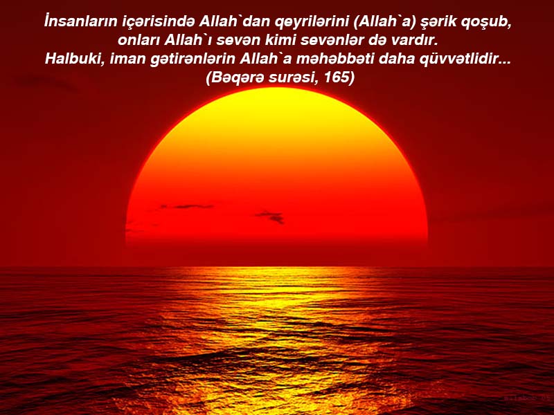 İnsanların içərisində Allah`dan qeyrilərini (Allah`a) şərik qoşub, onları Allah`ı sevən kimi sevənlər də vardır. Halbuki, iman gətirənlərin Allah`a məhəbbəti daha qüvvətlidir... (Bəqərə surəsi, 165)
