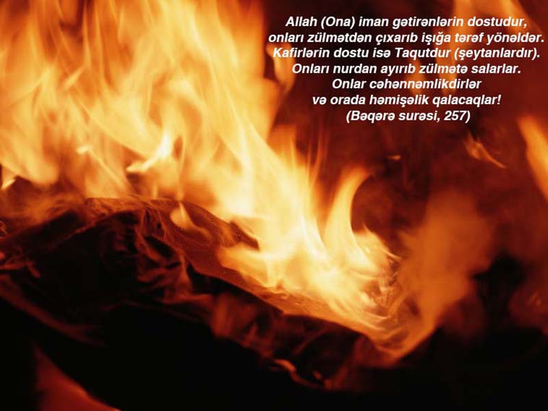 Allah iman gətirənlərin dostudur, onları zülmətdən çıxarıb işığa tərəf yönəldər. Kafirlərin dostu isə Taqutdur. Onları nurdan ayırıb zülmətə salarlar. Onlar cəhənnəmlikdirlər və orada həmişəlik qalacaqlar! (Bəqərə surəsi, 257)