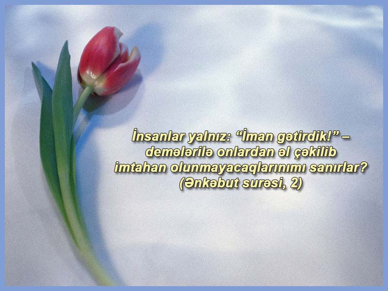İnsanlar elə güman edirlər ki, təkcə: “İman gətirdik!”– demələri ilə onlardan əl çəkiləcək və onlar imtahan edilməyəcəklər? (Ənkəbut surəsi, 2)