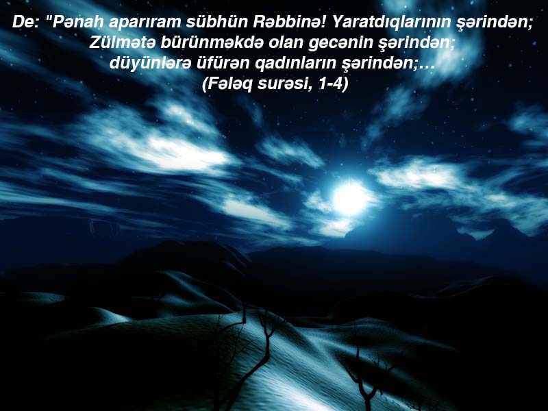 De: "Pənah aparıram sübhün Rəbbinə! Yaratdıqlarının şərindən; Zülmətə bürünməkdə olan gecənin şərindən; düyünlərə üfürən qadınların şərindən;… (Fələq surəsi, 1-4)