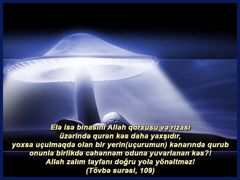 Elə isə binasını Allah qorxusu və rizası üzərində quran kəs daha yaxşıdır, yoxsa uçulmaqda olan bir yerin kənarında qurub onunla birlikdə cəhənnəm oduna yuvarlanan kəs?! Allah zalım tayfanı doğru yola yönəltməz! (Tövbə surəsi, 109)